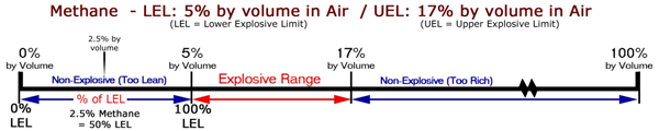 LEL: het laagste volumepercentage gas in lucht waarbij al een explosie kan ontstaan als er een ontstekingsbron, zoals een vonk of hittebron is.